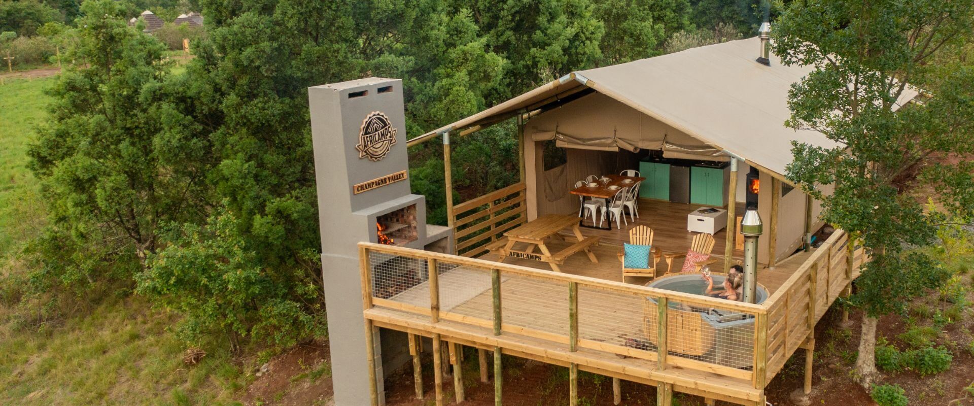 AfriCamps Champagne Valley ligt in het hart van Champagne Valley in het centrale deel van de Drakensbergen, en biedt bovenop de fantastische panoramische uitzichten en frisse berglucht een glampingvakantie met zoveel meer dan enkel de ‘basics’! Dit boetiek glampingkamp beschikt over verschillende tenten voor maximaal vijf personen, allemaal uitgerust met twee slaapkamers, een binnenhaard, een kitchenette en een ensuite badkamer met een ruime douche. De houten privéterrassen van 30 vierkante meter hebben een picknicktafel, ligstoelen, een braaiplek en een eigen houtgestookte hot tub. Je hebt zelfs Wi-Fi om die sprookjesachtige rosékleurige sundowners in de hot tub te delen! En met een volwaardig kookvuur, een magnetron en een koelkast in de tent wordt zelf koken een fluitje van een cent!