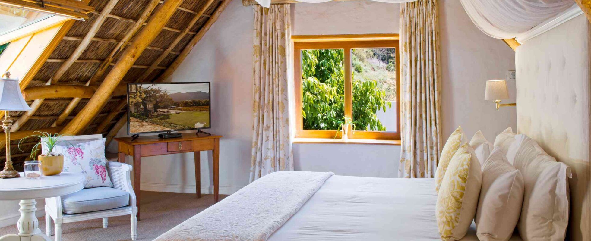 Gelegen tussen de pittoreske wijngaarden van Franschhoek en de Dassenberg Mountains, biedt Rickety Bridge Manor House een charmant verblijf compleet met een sprankelend zwembad en een adembenemend uitzicht op het omliggende landschap. Met een geschiedenis die teruggaat tot 1797 verwelkomt dit historische Kaaps-Hollandse landgoed al bijna twee eeuwen bezoekers. Er zijn 3 tweepersoonssuites in het landhuis en nog eens 10 in het aangrenzende pand, allemaal ensuite met bad en douche en voorzien van alle moderne voorzieningen zoals gratis WiFi, minibar, kabel-/satelliettelevisie, airconditioning, vloerverwarming, badjassen en verwarmde handdoekrekken. Begin je dag met een uitgebreid ontbijt, ga dan enkele lekkere wijntjes proeven en geniet tot slot van heerlijke bistrogerechten in Paulina’s restaurant.