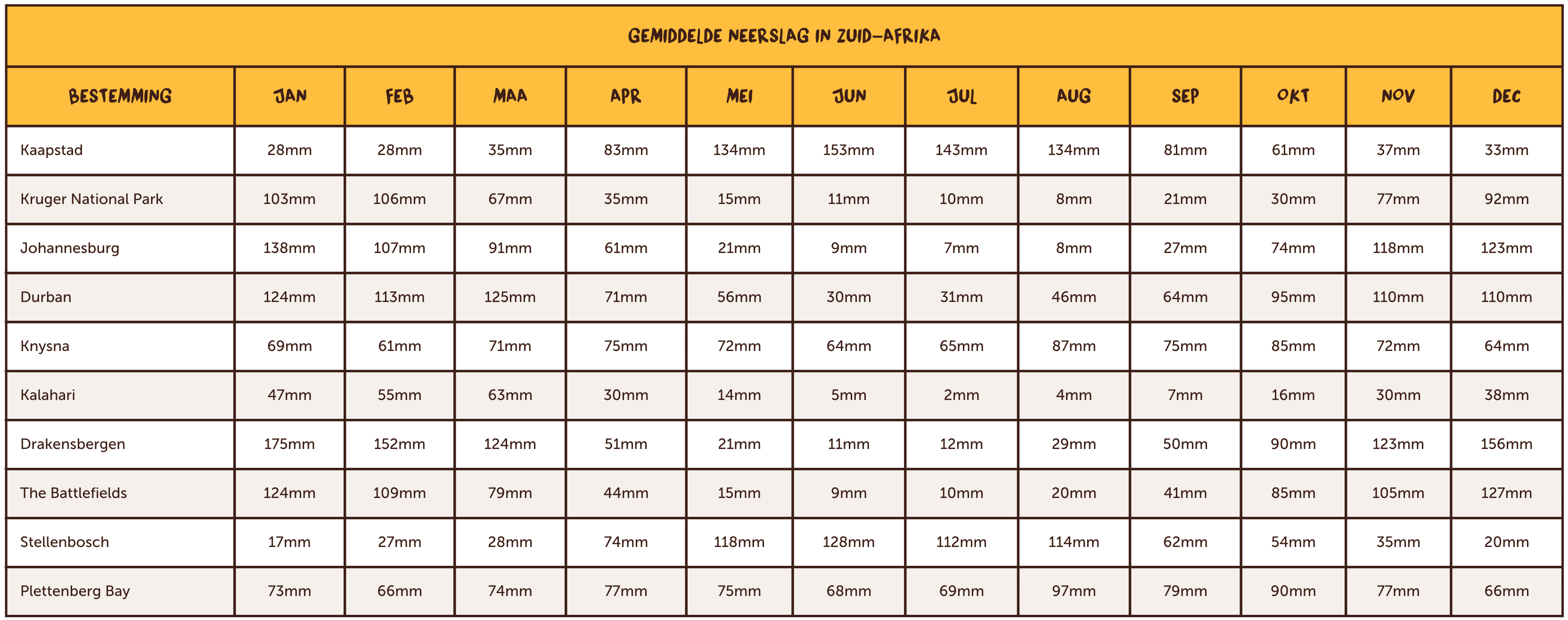 Als de zomer overgaat in de winter, ervaart Zuid-Afrika een gevarieerd klimaat. In de Westkaap zien regio’s als Kaapstad de gemiddelde temperatuur dalen tot ongeveer 20°C in mei en verder tot gemiddeld 17°C in juni en juli. In deze periode valt er veel regen in Kaapstad, met 134 mm in mei en 153 mm (het hoogtepunt van het regenseizoen) in juni. In Johannesburg schommelt de temperatuur in mei rond de 20°C en daalt deze in juni en juli tot 17°C. In mei valt er gemiddeld 21 mm neerslag, in juni slechts 9 mm.