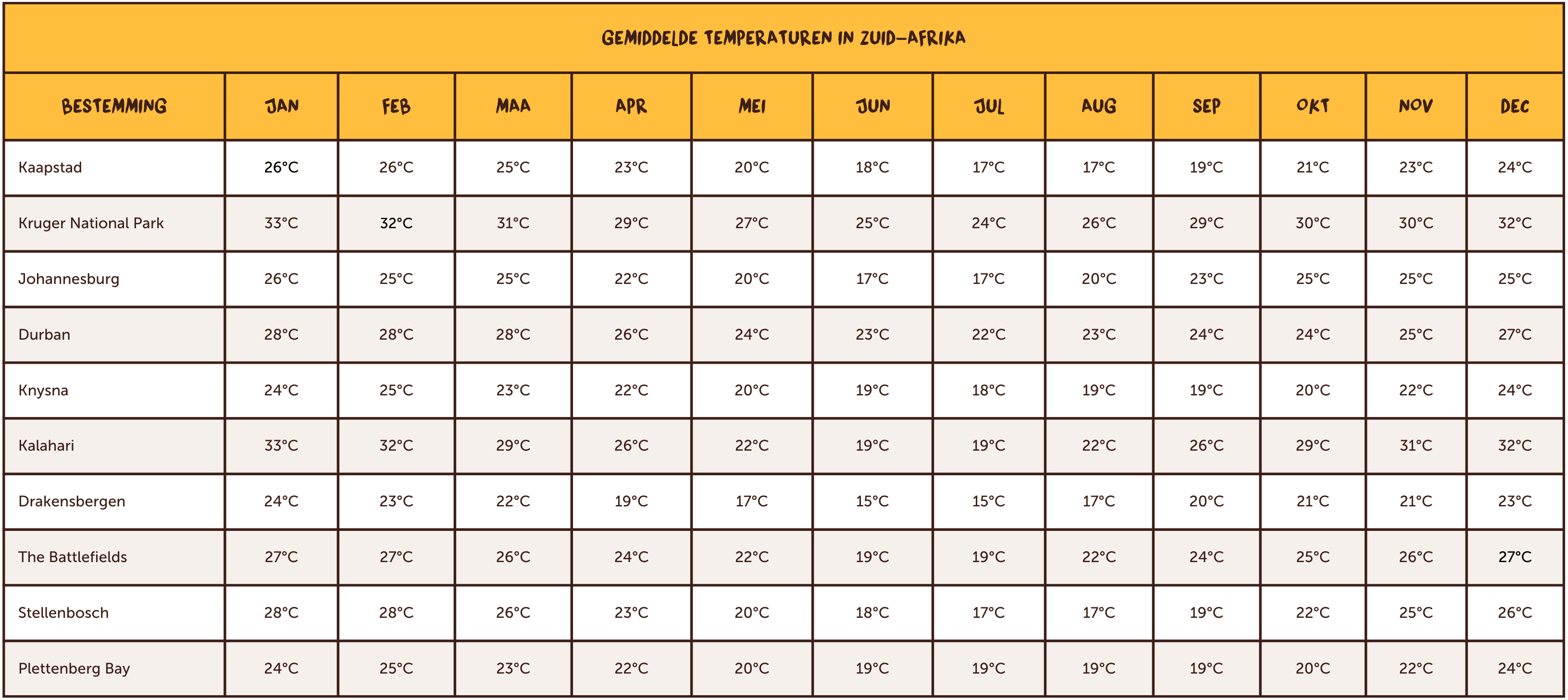 Plan je een reis naar Zuid-Afrika? Dan heb je meer nodig dan alleen zonnebrandcrème en safarilaarzen! Het weer in Zuid-Afrika kan je verrassen, van warme, zonnige dagen tot kille ochtenden, regen en zelfs sneeuw (jawel, het is mogelijk)! Nog verrassender is dat verschillende delen van het land totaal verschillende klimaten hebben, variërend van tropisch over woestijnachtig tot mediterraan. Dus als je op avontuur gaat, lees je hier wat je moet weten over het weer in de verschillende regio’s. Of je nu wilde dieren gaat spotten in Kruger of Kaapstad gaat verkennen, het weer speelt een belangrijke rol bij het bepalen van je reis. We zetten het even voor je op een rijtje!